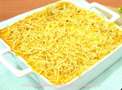 - Retire o refratário do forno e acrescente a batata palha por cima e retorne com o refratário ao forno por mais uns 2 minutos.